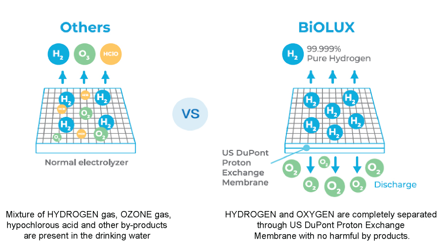 | Contaminations in Drinking Water | No harmful by-products but only pure HYDROGEN gas infused into drinking water. | The same water is used for both generating HYDROGEN gas and drinking. Electrodes may become contaminated with minerals due to chemical reactions in the water, resulting in impurities such as HYDROGEN peroxide, OZONE, chloride, sulfite compound etc. |