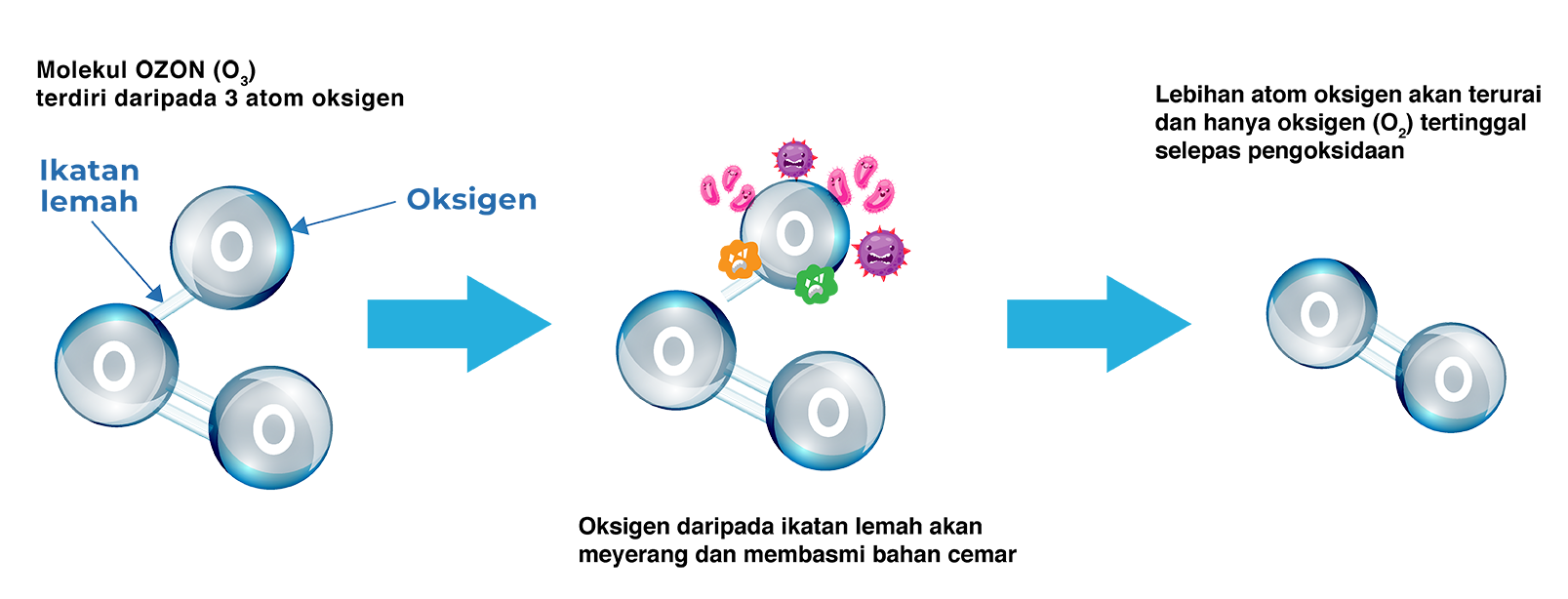 OZON adalah 3000 lebih cepat dalam pengoksidaan dan 50 kali lebih kuat prestasi pengoksidaan berbanding dengan klorin. OZON juga bebas daripada bahan kimia.