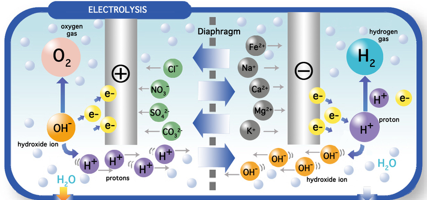 ELECTROLYSIS through several electrode plates and membranes, the filtered water is separated into acidic and alkaline parts through electric current. Water molecules (H₂O) are spited into OH- (hydroxide ions) and H+ (HYDROGEN ions).